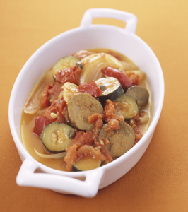 油がまわったら、トマトとAを加え、ふたをして弱火で30分ほど煮ます(野菜の水気で蒸し煮にする)。 |