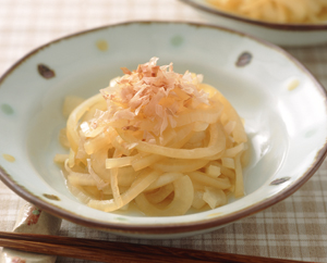 3 皿に(1)を広げ、ラップなしで、電子レンジで約2分加熱します。熱いうちにAをかけ、そのままさまします。