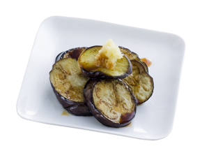 なすは5~6mm厚さの輪切りにする。フライパンに広げ、油をかけて全体にからめてから火をつけていためる。盛りつけ、しょうがをのせてしょうゆをかける。