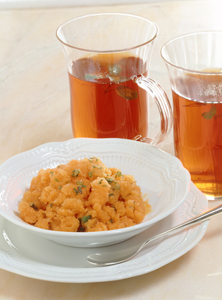 メモ: ペパーミントでもおいしい。写真奥がミント紅茶。手前はミント入りにんじんシャーベット
