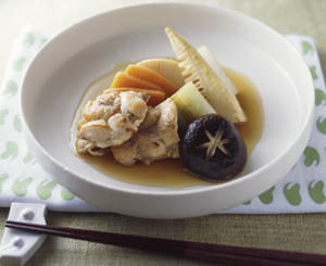 2 たけのこは、穂先は4cm長さのくし形に切り、太い部分は、1cm厚さの半月切りにします。にんじんは4cm長さの薄切りにします。ねぎは3~4cm長さに切り、しいたけは、軸をとり、飾り切りします。