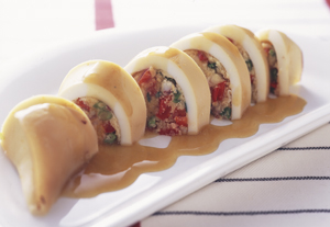 5 いかがさめたら、縦半分に切り、さらに1~1.5cm厚さに切り、器に盛ります。残った煮汁はざるでこし、水(材料外)をたして、100mlにします。小鍋に入れ、Cをもう一度混ぜて加えます。混ぜながらひと煮立ちさせてとろみをつけ、いかにかけます。