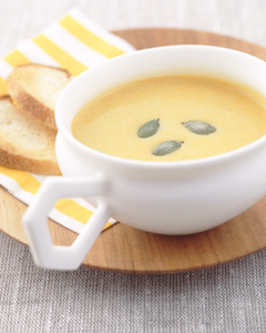 4 器に盛り、かぼちゃの種をのせます。トーストしたフランスパンを添えます。