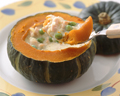 ミニかぼちゃのホワイトソース詰め 皮が器代わり。ミニだとかんたんに火が通ります